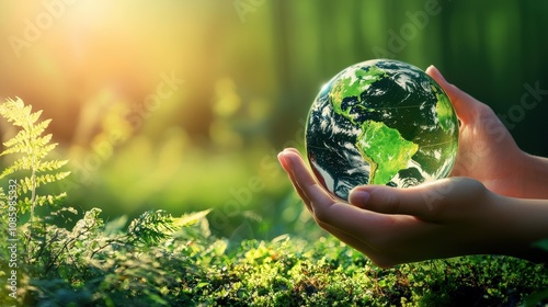 Hands holding a glass globe in a green forest, symbolizing environmental awareness and nature.