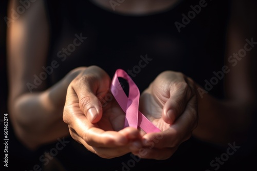 Hands holding a pink ribbon, the international symbol of breast cancer awareness.
