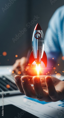 Hands holding a rocket launching with bright flames and sparks symbolizing startup success