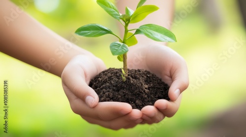 Hands holding a small green plant in soil.