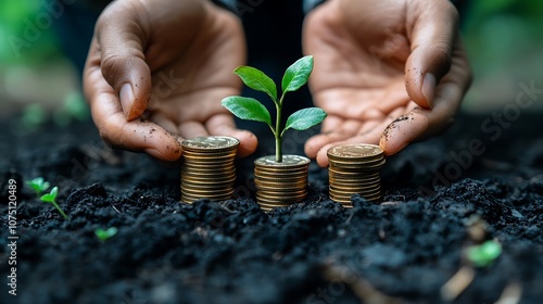 Hands holding coins with a growing tree, Coin with growing tree on hand
