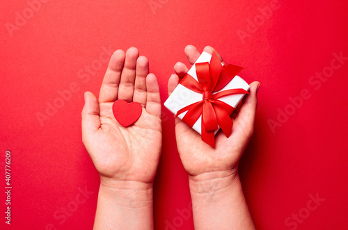 Hands holding gift box with small heart over red background