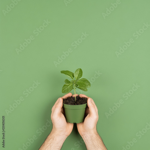 Hands holding small green plant in pot against green background