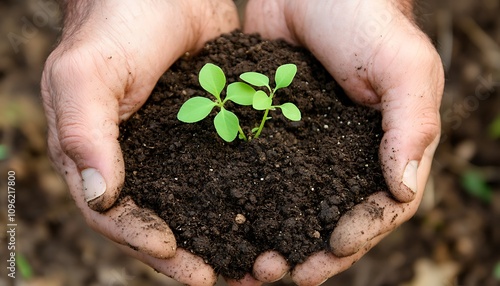 Hands holding soil with a small plant, symbolizing growth and nurturing the environment.