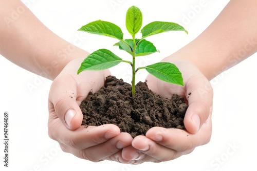 Hands holding young green plant isolated, young sprout in earth pile closeup, ecology, environmental protection