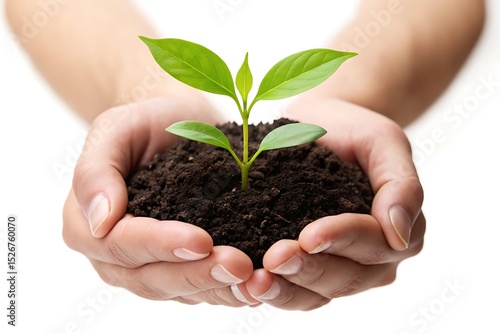 Hands holding young plant in soil, isolated on white background