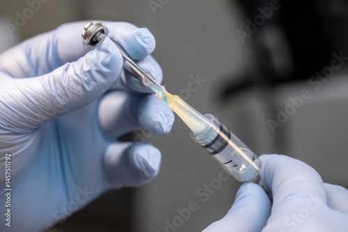 Hands in blue gloves carefully holding a syringe filled with a clear liquid, ready for injection.