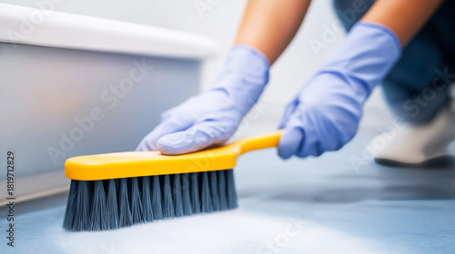 Hands in blue gloves scrubbing a floor surface with a yellow brush, performing cleaning duties for hygiene