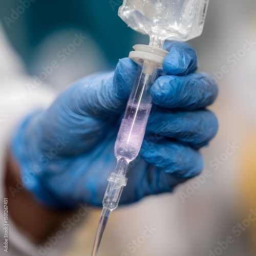 Hands in gloves adjusting a saline drip for medical treatment