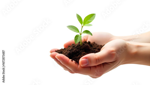 Hands nurturing a young plant with soil, set against a transparent background, representing sustainable agriculture and ecology