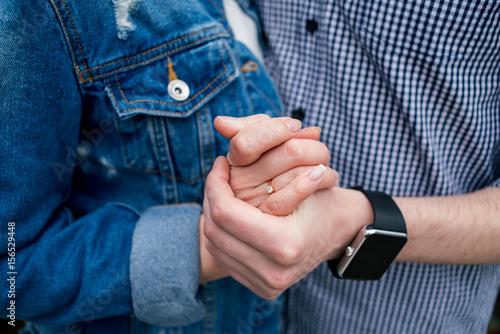 Hands of a couple in love. Man and woman are standing embracing and holding hands