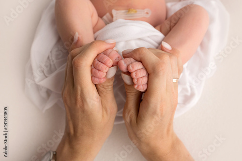 hands of parents. the legs of the newborn in the hands of mom and dad. baby's legs in his hands.