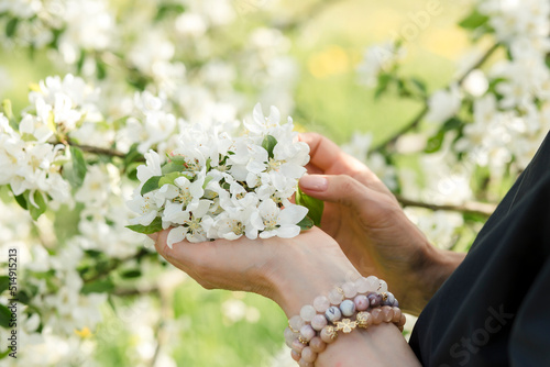 Hands of woman holding white flowers