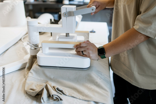 Hands Operating Modern Heat Press Machine on T-Shirt – Close-Up of DIY Custom Clothing Production Process in Workshop Environment