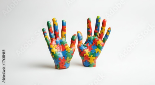 Hands painted in colorful puzzle piece pattern Symbolizes unity, diversity, and autism awareness