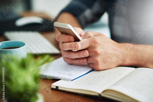 Hands, phone and businessperson in office with notebooks for research with creative project. Technology, closeup and copywriter with cellphone reading online review of blog post by desk at agency.
