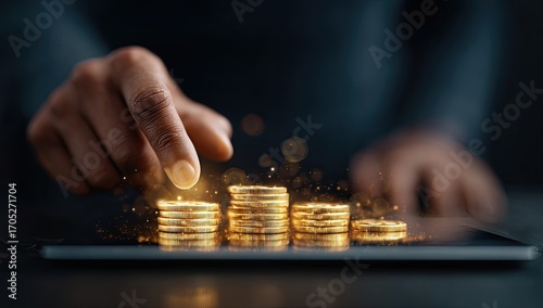 Hands placing golden coins on a tablet