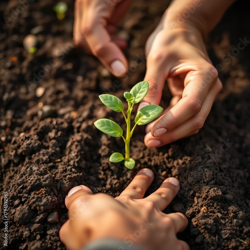 Hands planting a seedling directly into nutrient-rich soil with a focused, efficient motion, fast planting, speedy transplant