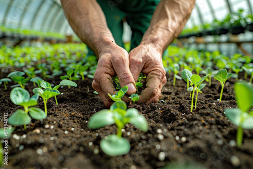 Hands planting seedlings in soil inside a greenhouse.