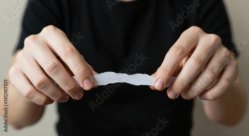 Hands tearing white paper strip. Concept of breaking barriers or revealing information ideal for conflict resolution and communication improvement campaigns