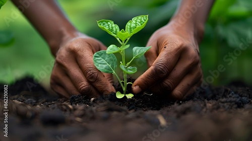 Hands tending to a young sprout in the ground, emphasizing environmental stewardship