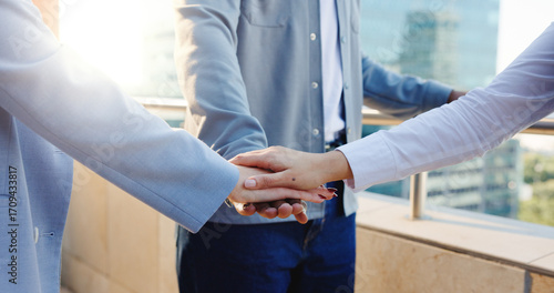 Hands together, team and meeting with business people in city for real estate deal, support and contract. Property developer, partnership and collaboration with employees on balcony for mission