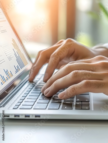 Hands Typing on Laptop with Business Plan Document and Analytics
