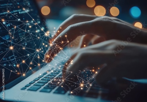 Hands Typing on Laptop with Network Connection Visualization
