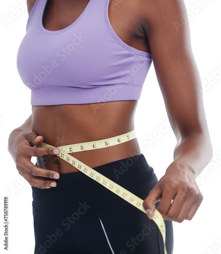 Hands, waist and measuring tape with body of person in studio isolated on white background for weight loss. Exercise, fitness or wellness with sports woman tracking progress of diet and training