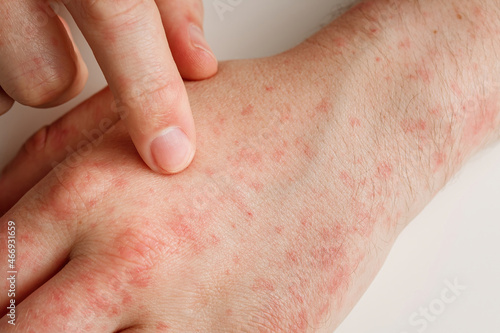 Hands with allergy reaction from taking medicines. By-effect, dermatology. Patient points on red spots on skin with forefinger, closeup