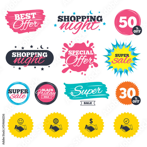 Handshake icons. World, Smile happy face.
