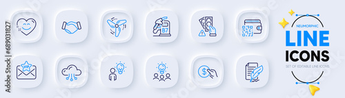 Handshake, Qr code and Diesel station line icons for web app. Pack of Bribe, Feather signature, Group people pictogram icons. Smile chat, Cloud computing, Payment signs. Vip mail. Vector