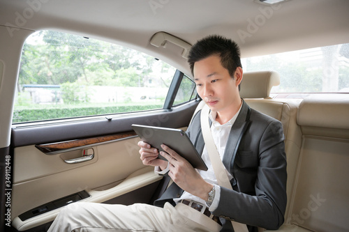 Handsome asian businessman working with tablet. Young executive manager Full concentration at work while sitting in the car.