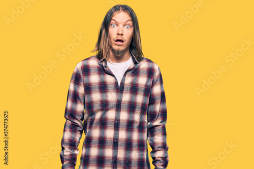 Handsome caucasian man with long hair wearing hipster shirt afraid and shocked with surprise expression, fear and excited face.