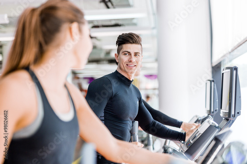 Handsome man and beautiful young woman using a stepper in a gym