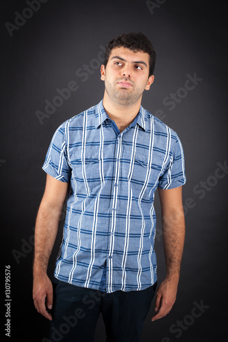 Handsome man doing different expressions in different sets of clothes: bored