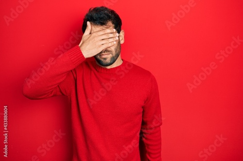 Handsome man with beard wearing casual red sweater covering eyes with hand, looking serious and sad. sightless, hiding and rejection concept