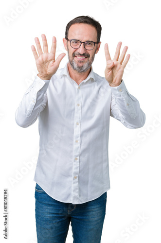 Handsome middle age elegant senior business man wearing glasses over isolated background showing and pointing up with fingers number nine while smiling confident and happy.