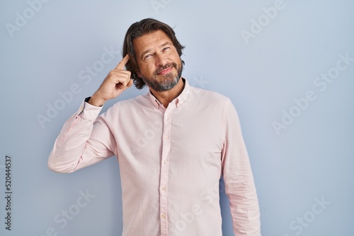 Handsome middle age man wearing elegant shirt background smiling pointing to head with one finger, great idea or thought, good memory