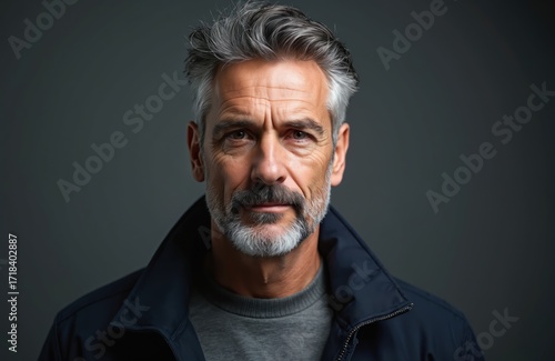 Handsome middle-aged man with gray hair, beard. Studio portrait, dark background. Serious expression, thoughtful gaze. Modern adult male, pro look, stylish, 40s, father figure. Headshot, closeup,