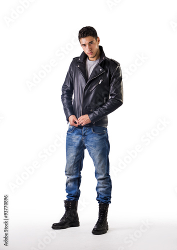 Handsome young man wearing leather jacket, t-shirt and jeans