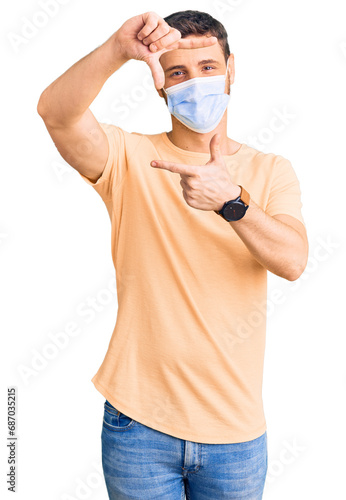 Handsome young man with bear wearing medical mask for coronavirus smiling making frame with hands and fingers with happy face. creativity and photography concept.