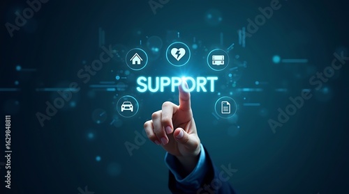 hand-touching-virtual-screen-with-support-service-icons-blue-background-text-support