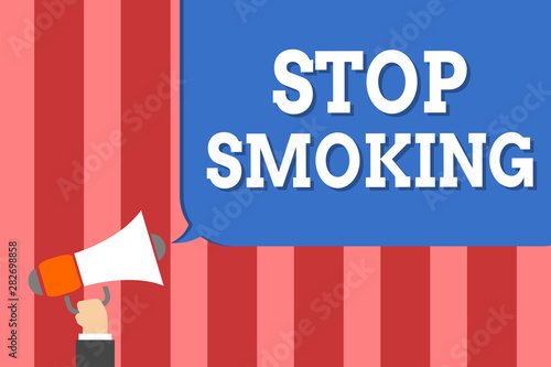 Handwriting text writing Stop Smoking. Concept meaning Discontinuing or stopping the use of tobacco addiction Man holding megaphone loudspeaker speech bubble message speaking loud