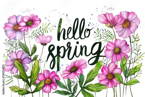 Handwritten "hello spring" Flower like a bouquet with leaves on a white background