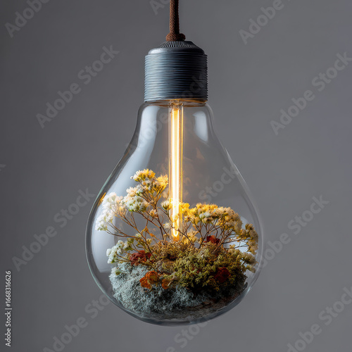 Hanging lightbulb with unique design features miniature terrarium inside, showcasing delicate flowers and moss. warm glow creates cozy and artistic ambiance