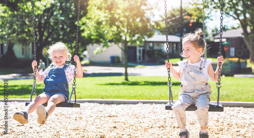 Happy 3 years old girl on a swing. Happy kid on playground