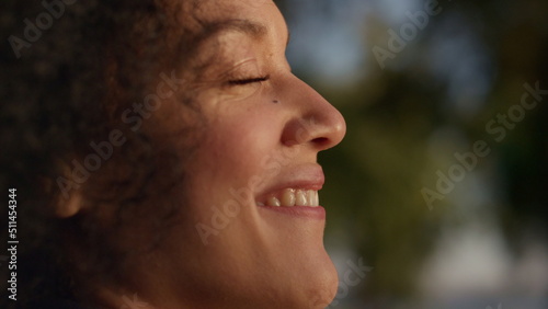 Happy african american woman enjoying warm golden sunlight outdoors portrait.