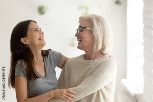Happy aged mother and millennial daughter have fun laughing