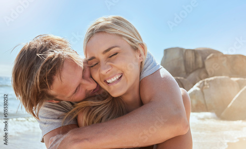 Happy and loving couple enjoying a a day at the beach in summer. Cheerful husband hugging his joyful wife while standing at the seashore on holiday. Boyfriend and girlfriend spending time together